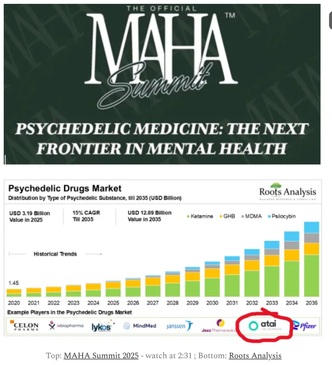 Nonetheless the psychedelic drug market is estimated to expand from 3B in 2025 to almost 13B in 2035. Among the big players is Atai Life Sciences whose founder, Christian Altermayer, was exclaiming his conviction that psychedelic mental health care was the next big thing in front of the American public at the MAHA event in November 2025.