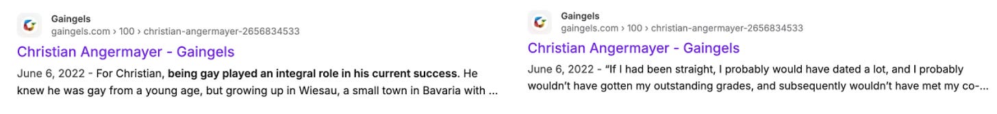 Angermayer is a Young Global Leader of the World Economic Forum which in turn supports the UN Partnership for LGBTIQ Equality. Angermayer, like Thiel and many other tech gurus, hangs in LGBTQ+ circles. Whether he is homosexual or not is unclear.